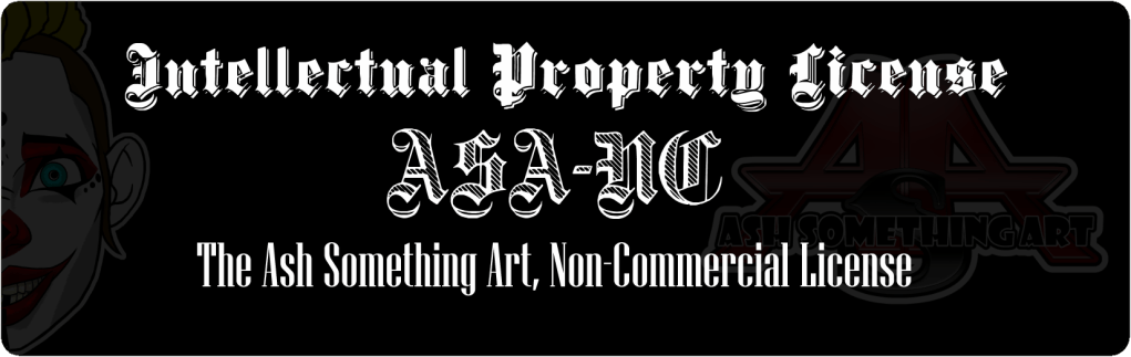 Ash Something Art is considered the Author and Owner of the art/IP. Ash Something Art retains all rights and may re-license, sub-license, or sell the IP rights/art for profit at their own discretion. You may not claim that you own the art (Ownership) or that you created it (Authorship). You may not register a copyright or trademark on the art, or do anything else that subverts Ash Something Art’s own rights/claims over the work. You may only use the art in the ways described in this license’s terms. - This license Requires Attribution: